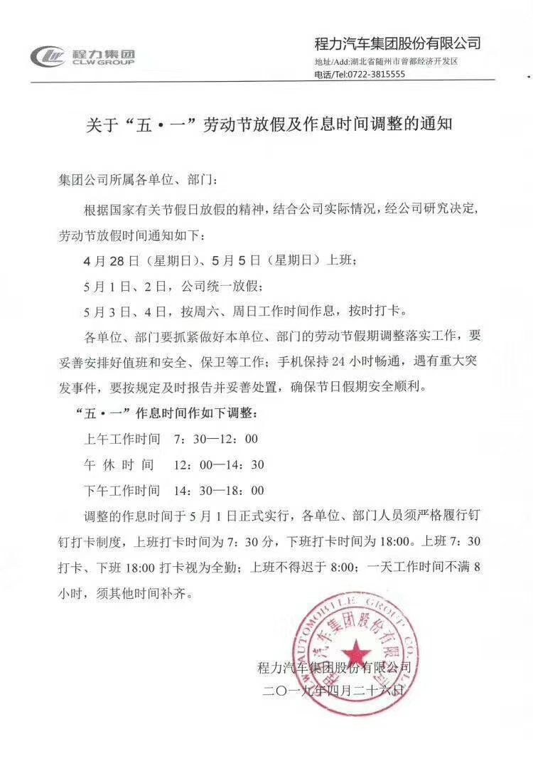 2019湖北程力集團五一放假安排和作息時間調整通知