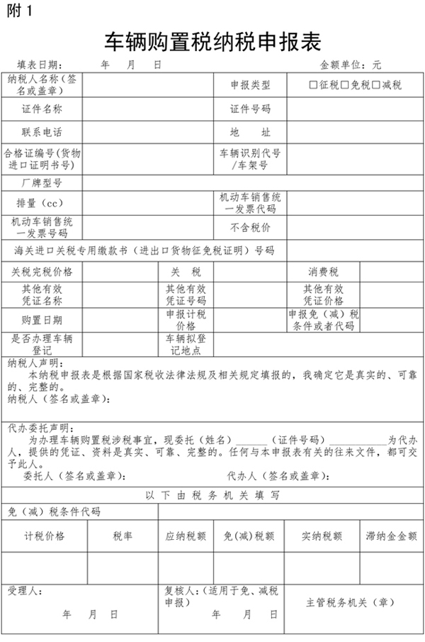 《車輛購置稅納稅申報表》填表說明 1.本表由車輛購置稅納稅人在辦理納(免、減)稅申報時填寫(打印),由納稅人簽章確認。 2.“納稅人名稱”欄,填寫辦理申報時提供的納稅人證件上注明的名稱。 3.“證件名稱”欄,單位納稅人填寫《統(tǒng)一社會信用代碼證書》或者《營業(yè)執(zhí)照》或者其他有效機構證明;個人納稅人填寫《居民身份證》或者其他身份證明名稱。 4.“證件號碼”欄,填寫“證件名稱”欄填寫的證件的號碼。 5.“合格證編號(貨物進口證明書號)”“車輛識別代號/車架號”“廠牌型號”“排量(cc)”欄,分別按照車輛合格證或者《中華人民共和國海關貨物進口證明書》或者《中華人民共和國海關監(jiān)管車輛進(出)境領(銷)牌照通知書》或者《沒收走私汽車、摩托車證明書》中對應的編號、車輛識別代號/車架號、車輛品牌和車輛型號、排量填寫。 6.“機動車銷售統(tǒng)一發(fā)票代碼”“機動車銷售統(tǒng)一發(fā)票號碼”“不含稅價”欄,分別按照機動車銷售統(tǒng)一發(fā)票相應項目填寫。 7.下列欄次由進口自用車輛的納稅人填寫: 。1)“海關進口關稅專用繳款書(進出口貨物征免稅證明)號碼”欄,填寫《海關進口關稅專用繳款書》中注明的號碼;免征關稅應稅車輛填寫《進出口貨物征免稅證明》中注明的編號。 。2)“關稅完稅價格”欄,通過《海關進口關稅專用繳款書》《海關進口消費稅專用繳款書》《海關進口增值稅專用繳款書》或者其他資料進行采集,順序如下: 、佟逗jP進口關稅專用繳款書》中注明的關稅完稅價格; 、 在免關稅的情況下,通過《海關進口消費稅專用繳款書》中注明的完稅價格和消費稅稅額計算關稅完稅價格; ③ 在免關稅和免或者不征消費稅的情況下,采用《海關進口增值稅專用繳款書》中注明的完稅價格; 、 在關稅、消費稅和增值稅均免征或者不征的情況下,通過其他資料采集關稅完稅價格。 。3)“關稅”欄,填寫《海關進口關稅專用繳款書》中注明的關稅稅額。 (4)“消費稅”欄,填寫《海關進口消費稅專用繳款書》中注明的消費稅稅額。 8.“其它有效憑證名稱”“其它有效憑證號碼”“其它有效憑證價格”欄由未取得機動車銷售統(tǒng)一發(fā)票且非進口自用的納稅人按取得的相應證明資料內容填寫。 9.“購置日期”欄,填寫機動車銷售統(tǒng)一發(fā)票或者海關進口關稅專用繳款書(進出口貨物征免稅證明)或者其他有效憑證的開具或者生效日期。 10.“申報計稅價格”欄,分別按照下列要求填寫: (1)境內購置車輛,按照車輛相關憑證的不含稅價填寫; (2)進口自用車輛,按計稅價格填寫,計稅價格=關稅完稅價格+關稅+消費稅; 11.“申報免(減)稅條件或者代碼”欄,分別按照下列情形填寫文字或者代碼: A.外國駐華使館、領事館和國際組織駐華機構及其有關人員自用的車輛,免稅; B.中國人民解放軍和中國人民武裝警察部隊列入裝備訂貨計劃的車輛,免稅; C.懸掛應急救援專用號牌的國家綜合性消防救援車輛,免稅; D.設有固定裝置的非運輸專用作業(yè)車輛,免稅; E.城市公交企業(yè)購置的公共汽電車輛,免稅; F.國務院規(guī)定予以免稅或者減稅的其他情形的,按照規(guī)定免稅或者減稅。 12.“是否辦理車輛登記”欄,如填寫“是”,則“車輛擬登記地點”欄應填寫具體縣(市、區(qū))。 13.本表一式二份(一車一表),一份由納稅人留存,一份由主管稅務機關留存。
