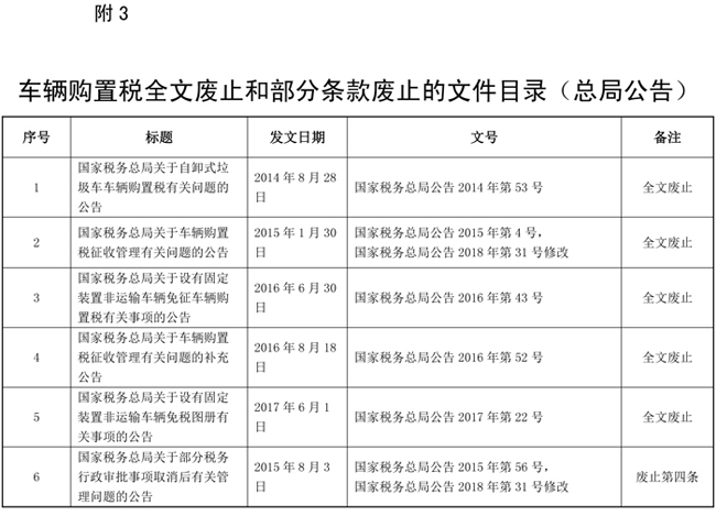為落實《中華人民共和國車輛購置稅法》(以下簡稱《車購稅法》),規(guī)范車輛購置稅征收管理,現(xiàn)就有關事項公告如下: 一、車輛購置稅實行一車一申報制度。 二、《車購稅法》第六條第四項所稱的購置應稅車輛時相關憑證,是指原車輛所有人購置或者以其他方式取得應稅車輛時載明價格的憑證。無法提供相關憑證的,參照同類應稅車輛市場平均交易價格確定其計稅價格。無同類應稅車輛市場平均交易價格的,由稅務機關依據(jù)《中華人民共和國稅收征收管理法》(以下簡稱《稅收征管法》)及其實施細則核定其應納稅額。 原車輛所有人為車輛生產(chǎn)或者銷售企業(yè),未開具機動車銷售統(tǒng)一發(fā)票的,按照車輛生產(chǎn)或者銷售同類應稅車輛的銷售價格確定應稅車輛的計稅價格。無同類應稅車輛銷售價格以及同類應稅車輛無銷售價格的,按照組成計稅價格確定應稅車輛的計稅價格。 三、購置應稅車輛的納稅人,應當?shù)较铝械攸c申報納稅: 。ㄒ唬┬枰k理車輛登記的,向車輛登記地的主管稅務機關申報納稅; (二)不需要辦理車輛登記的,單位納稅人向其機構所在地主管稅務機關申報納稅,個人納稅人向其戶籍所在地或者經(jīng)常居住地的主管稅務機關申報納稅。 四、《車購稅法》第十二條所稱納稅義務發(fā)生時間,按照下列情形確定: 。ㄒ唬┵徺I自用應稅車輛的為購買之日,即車輛相關價格憑證的開具日期; 。ǘ┻M口自用應稅車輛的為進口之日,即《海關進口增值稅專用繳款書》或者其他有效憑證的開具日期; (三)自產(chǎn)、受贈、獲獎或者以其他方式取得并自用應稅車輛的為取得之日,即合同、法律文書或者其他有效憑證的生效或者開具日期。 五、納稅人辦理納稅申報時應當如實填報《車輛購置稅納稅申報表》(附件一,以下簡稱《納稅申報表》),同時提供車輛合格證明和車輛相關價格憑證。 六、納稅人在辦理車輛購置稅免稅、減稅時,除按本公告第五條規(guī)定提供資料外,還應當根據(jù)不同的免減稅項目,分別提供以下資料的原件或者復印件: 。ㄒ唬┩鈬v華使館、領事館和國際組織駐華機構及其有關人員自用車輛,提供機構證明和外交部門出具的身份證明。 。ǘ┏鞘泄黄髽I(yè)購置的公共汽電車輛,提供所在地縣級以上(含縣級)交通運輸主管部門出具的公共汽電車輛認定表。 (三)懸掛應急救援專用號牌的國家綜合性消防救援車輛,提供中華人民共和國應急管理部批準的相關文件。 。ㄋ模┗貒⻊盏脑谕饬魧W人員購買的自用國產(chǎn)小汽車,提供海關核發(fā)的《中華人民共和國海關回國人員購買國產(chǎn)汽車準購單》。 (五)長期來華定居專家進口自用小汽車,提供國家外國專家局或者其授權單位核發(fā)的專家證或者A類和B類《外國人工作許可證》。 七、免稅、減稅車輛因轉讓、改變用途等原因不再屬于免稅、減稅范圍的,納稅人在辦理納稅申報時,應當如實填報《納稅申報表》。發(fā)生二手車交易行為的,提供二手車銷售統(tǒng)一發(fā)票;屬于其他情形的,按照相關規(guī)定提供申報材料。 八、已經(jīng)繳納車輛購置稅的,納稅人向原征收機關申請退稅時,應當如實填報《車輛購置稅退稅申請表》(附件二,以下簡稱《退稅申請表》),除提供納稅人身份證明外,還應當按照下列情況分別提供以下資料: (一)車輛退回生產(chǎn)企業(yè)或者銷售企業(yè)的,提供生產(chǎn)企業(yè)或者銷售企業(yè)開具的退車證明和退車發(fā)票。 。ǘ┢渌罁(jù)法律法規(guī)規(guī)定應當退稅的,根據(jù)具體情形提供相關資料。 九、納稅人應如實申報應稅車輛的計稅價格。 納稅人沒有編造虛假計稅依據(jù)的,稅務機關按照其申報的計稅價格征收稅款;納稅人編造虛假計稅依據(jù)的,稅務機關依照《稅收征管法》及其實施細則的相關規(guī)定處理。 十、稅務機關追繳稅款時,納稅人無法按照規(guī)定提供申報資料的,可以依據(jù)司法、審計、財政等有關機關的文書,為其辦理補稅手續(xù)。 十一、本公告要求納稅人提供的資料,稅務機關能夠通過政府信息共享等手段獲取相關資料信息的,納稅人不再提交。 十二、本公告所稱的納稅人身份證明:單位納稅人為《統(tǒng)一社會信用代碼證書》或者營業(yè)執(zhí)照或者其他有效機構證明,個人納稅人為居民身份證或者居民戶口簿或者入境的身份證件。 本公告所稱車輛合格證明為整車出廠合格證或者車輛電子信息單。 本公告所稱車輛相關價格憑證,境內購置車輛為機動車銷售統(tǒng)一發(fā)票或者其他有效憑證,進口自用車輛為《海關進口關稅專用繳款書》或者海關進出口貨物征免稅證明。屬于應征消費稅車輛的還包括《海關進口消費稅專用繳款書》。 十三、稅務機關應當在稅款足額入庫或者辦理免稅手續(xù)后,將應稅車輛完稅或者免稅電子信息,及時傳送給公安機關交通管理部門。 上款所指稅款足額入庫的情形包括:納稅人到銀行辦理車輛購置稅稅款繳納(轉賬或者現(xiàn)金)由銀行將稅款繳入國庫的,國庫已傳回《稅收繳款書(銀行經(jīng)收專用)》聯(lián)次;納稅人通過橫向聯(lián)網(wǎng)電子繳稅系統(tǒng)等電子方式繳納稅款的,稅款劃繳已成功;納稅人在辦稅服務廳以現(xiàn)金方式繳納稅款的,主管稅務機關已收取稅款。 十四、納稅人名稱、車輛廠牌型號、發(f