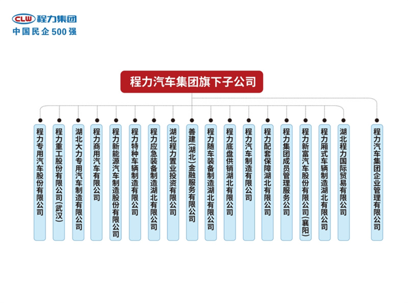 程力集團的成員企業包括程力專用汽車股份有限公司湖北大力專用汽車制造有限公司程力重工股份有限公司程力新能源汽車制造股份有限公司、湖北程力置業投資有限公司、程力商用汽車有限公司以及程力應急裝備制造湖北有限公司等