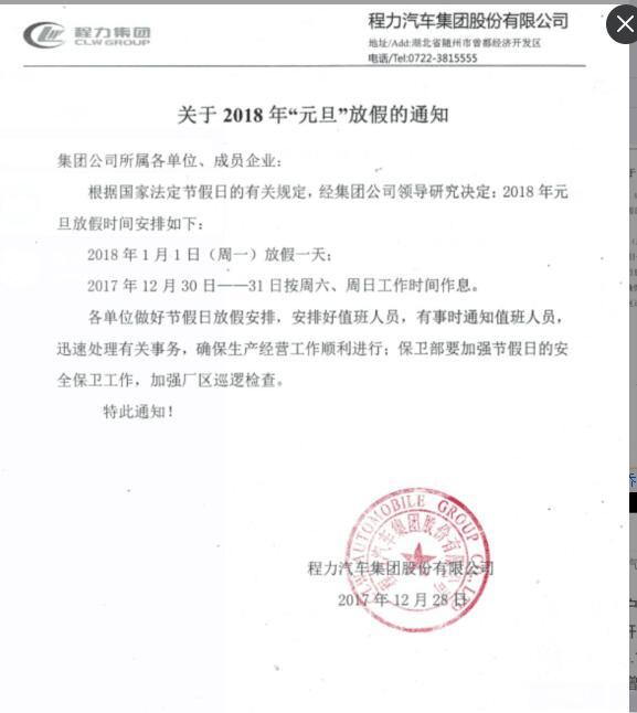 導讀:為了方便客戶購車,提前安排購車時間和計劃,湖北程力公司,先提前公布公司放假時間通知,元旦放假時間為:12月30,31,1號三天假期,與國家的法定節假日同步,如…