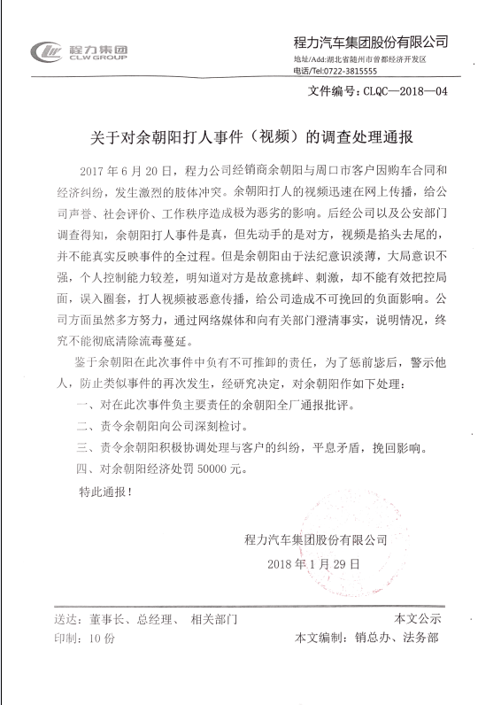 湖北程力關于對于余朝陽打人事件視頻的調查處理通報
