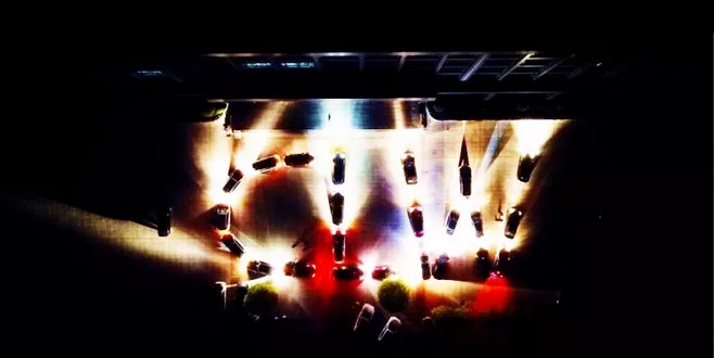 大概八點半的時候,CLW初見雛形,大家都進自己的車內試燈光和雙閃,希望在航拍的時候出現最佳效果。屏上顯示,這個C呢有點小,把弧度再稍微調大一點,還差一輛呢,這時,程總給了我們最大的支持,調動了自己的瑪莎拉蒂來壓軸,非誠勿擾的音樂想起,大BOSS在最后出場了。