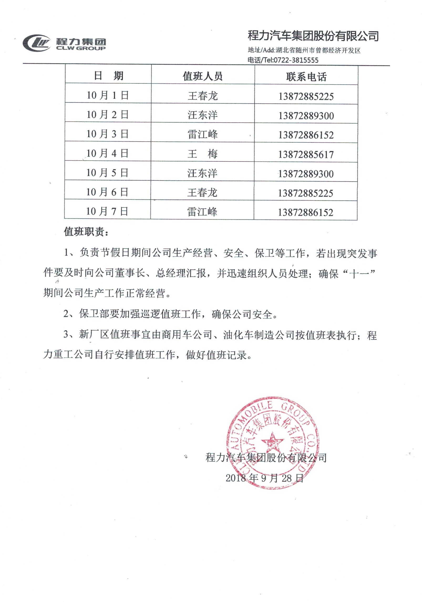 湖北程力公司2018年“國慶節”放假值班人員安排及更改作息時間的通知