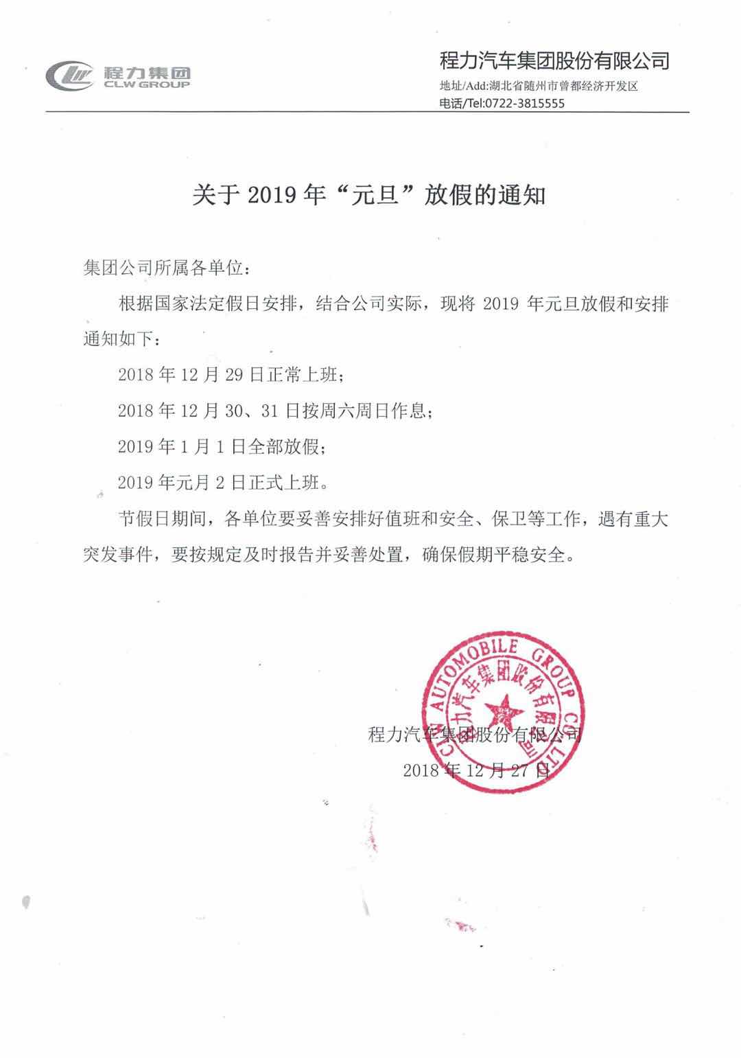 湖北程力汽車集團(tuán)2019年元旦放假通知: