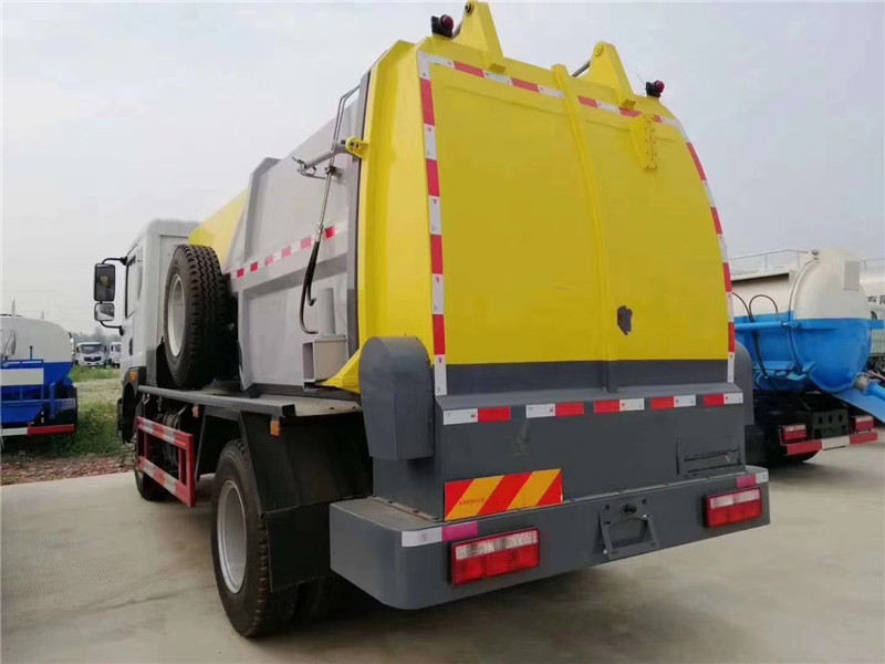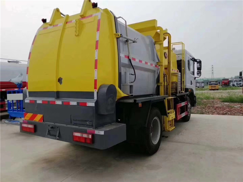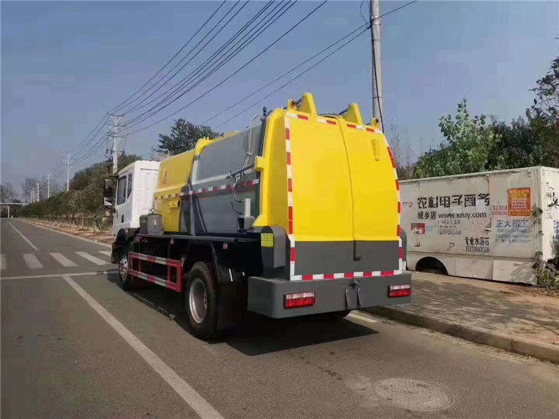 c、罐體容積8.5-10方,罐體帶舉升功能,后門液壓控制開啟關閉,帶液壓鎖緊功能,拉桿提升機聯動頂蓋完美設計,收集時滴水不漏。提升架可掛 120L/240L 標準塑料垃圾桶