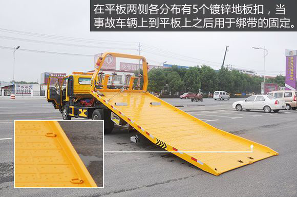 在平板兩側各分布有5個鍍鋅地板扣,當事故車輛上到平板上之后用于綁帶的固定。