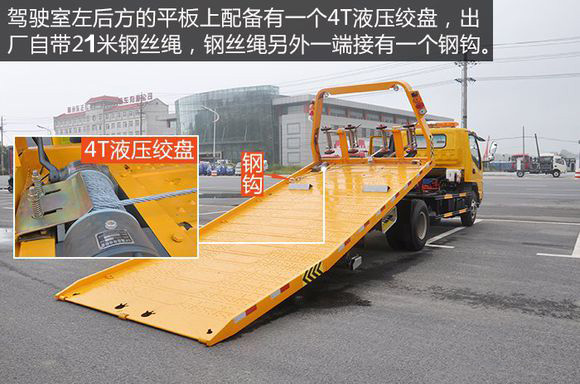駕駛室左后方的平板上配備有一個4T液壓絞盤,出廠自帶25米鋼絲繩,鋼絲繩另外一端接有一個鋼鉤,便于拖車時進行牽引。