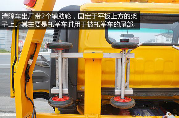 江淮平板一拖二清障車出廠帶2個輔助輪,固定于平板上方的架子上。其主要是托舉車時用于被托舉車的尾部。