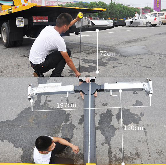 從圖中我們可以清晰的看到,底盤尾部加裝有L型臂安裝架,左右兩側有一對L型拖叉,其作用主要是托舉車輛時,能抱緊輪胎,防止輪胎滑落。
