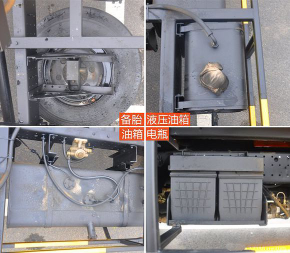 我們再來看看底盤上各零部件的分配,電瓶置于駕駛室左后方,與之對應的右后方是油箱,油箱后方則是液壓油箱,緊隨其后的就是備胎。各零部件在不影響美觀的前提下,分配合理,實用性也很強。