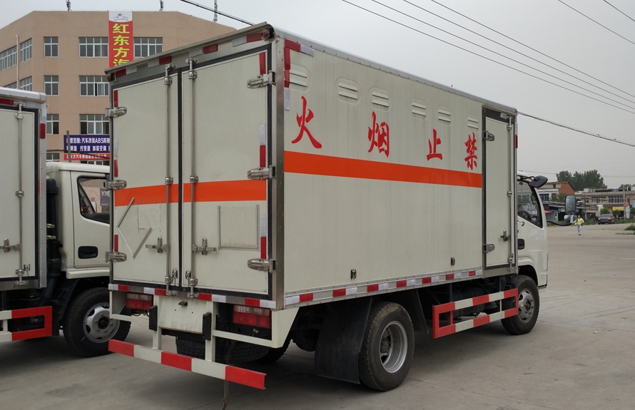 1、廂體部分:廂體為雙層金屬骨架結構,外部為冷扎鋼板,內壁采用鋁合金板蒙面,夾層為隔熱阻燃材料填充。設置對開門,側壁設有防雨功能自然通風窗口,以使廂內外空氣流動,廂體內部做防靜電處理,廂體底部與廂內前部鋪有阻燃導靜電膠板,并與底盤等電位連接,通過車輛后端的導靜電裝置與大地相連,可防止靜電火花的產生和車輛靜電及時釋放,提高易燃氣體廂式運輸車的安全性。廂體內部前面和側面裝有固定拉環,與捆綁帶使用捆綁貨物以避免移動,保證安全。