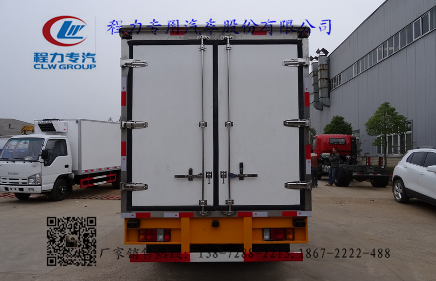 2.上裝配置:冷藏廂體內部有效尺寸:長4.1米×寬1.74米×高1.75米,廂體蒙皮采用內外玻璃鋼,隨客戶選擇內置槽鋼焊接骨架或者玻璃纖維超輕高強度骨架,8cm厚聚氨酯發泡保溫層,不銹鋼包角,不銹鋼門框,不銹鋼門鎖件,花紋鋁底板,配后雙開門,可以選開側門,-5~-18度制冷機組可選。可以安裝肉鉤等內部設施。