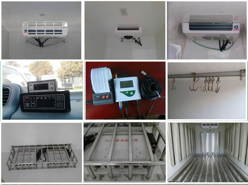 冷藏車制冷機組一般都加裝在貨柜的前面頂部,有空調般的外形,但比同體積的空調具有更強的制冷能力。一般車型都采用外置式冷機,少數微型冷藏車采用內置式冷機。對于溫度要求較低的冷藏車,可采用廂體內置冷板。一般根據冷藏廂體的容積和運輸的貨物對溫度的要求,來選擇不同功率制冷量的制冷機組。